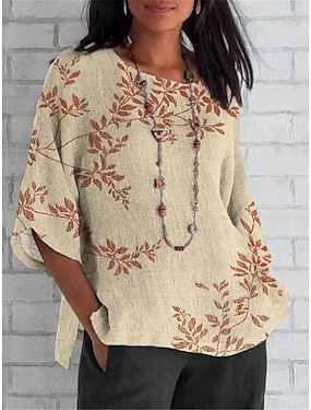 Жен. Рубашки из хлопка и льна Цветочный принт На каждый день Рукав 3/4 Вырез под горло Обычные топы Повседневные С принтом Черный Красный Лиловый Зеленый Лето