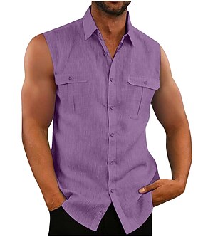 Муж. Хлопково-льняная рубашка Летняя рубашка Повседневная рубашка Пляжная рубашка Сплошной/однотонный цвет Гавайский Черный Синий Лиловый Зеленый Без рукавов Рубашечный воротник Лето Одежда