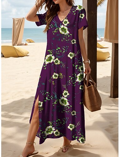 Жен. Длинное платье Вязаное платье Повседневное платье Сарафан Платье A-силуэта Элегантный стиль Отпуск На каждый день Пляж Стандартный Цветочный принт Графика С короткими рукавами V-образный вырез
