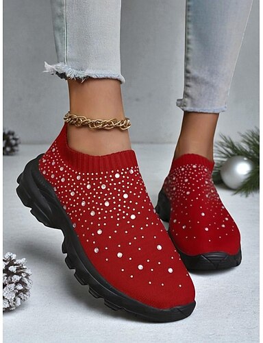 Жен. Кеды Flyknit обувь Рождество Повседневные Стразы На плоской подошве Круглый носок На каждый день Удобная обувь Для прогулок Бег по городу Летающее плетение Лоферы Черный Белый Розовый