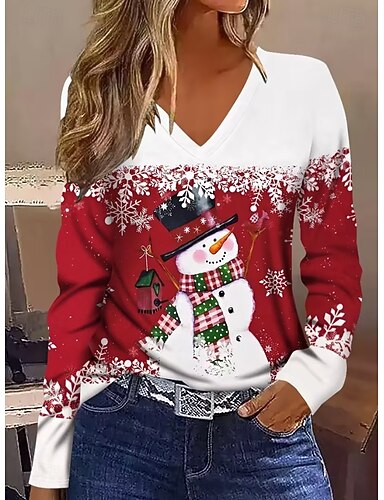 Новогодняя тематика Жен. Футболка Графика Рождество Винтаж Стиль Классика Длинный рукав V-образный вырез Обычные топы Повседневные С принтом Черный Винный Красный Синий Зеленый Весна Осень Зима