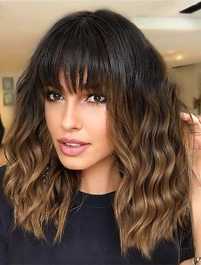 короткий волнистый парик с челкой для женщин, длина до плеч, вьющиеся женские очаровательные синтетические парики с натуральными волнистыми термостойкими волосами от черного до коричневого цвета для