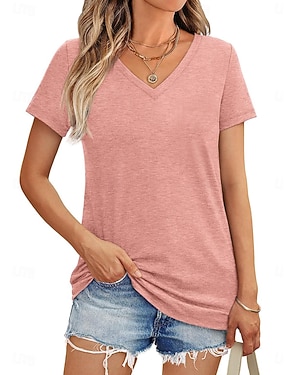 Жен. Футболка Сплошной цвет Полотняное плетение Классический Классический На каждый день С короткими рукавами V-образный вырез Обычные топы Повседневные С принтом Розовый Лето