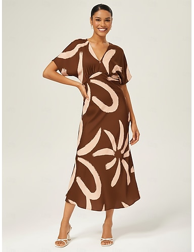 Женское макси-платье кофейного цвета с абстрактным цветочным принтом, атласное, с V-образным вырезом, рукавами «летучая мышь», с поясом, элегантное, для отдыха, весна-лето-осень