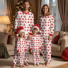 Семейный вид Новогодняя тематика Рождественская семейная пижама Пижамы Семейные наборы Графика Снеговик Пряничные человечки Дом С принтом Белый Длинный рукав Повседневные Подходящие наряды