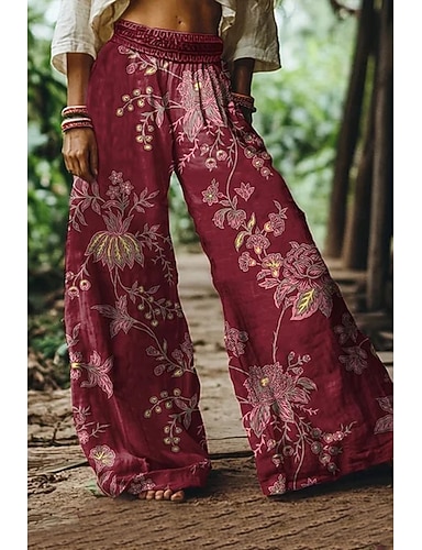 Жен. Брюки, вдохновленные льном Широкие Брюки палаццо Мода Богемный Полная длина Завышенная Цветы Эластичная талия Дышащий Удобный Слабоэластичная Для улицы На каждый день На выход