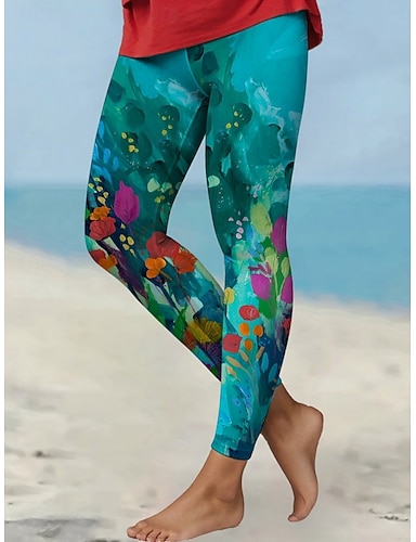 Жен. Брюки Леггинсы Уличный стиль На каждый день Полная длина Завышенная Цветочный принт Эластичная талия С принтом Воздухопроницаемость Удобный Эластичная Отпуск Для улицы На каждый день Синий