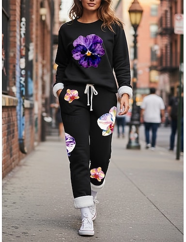 Жен. Элегантный стиль Теплый Мода Комплекты из двух предметов Спортивный костюм Комплекты брюк Длинный рукав Вырез под горло Цветочный принт С принтом на открытом воздухе Отпуск Повседневные