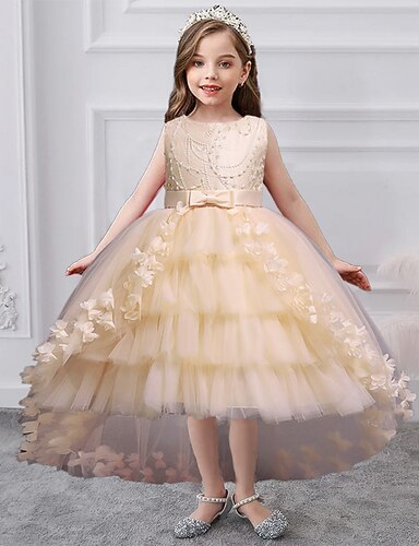 Дети Девочки Платье для девочки-цветочницы Платье Однотонный Без рукавов Выступление Свадьба Для вечеринок Сетка Бант Принцесса Милая Хлопок Тюль Ассиметричное Платье A-силуэта Лето Весна 3-12 лет