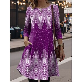 Жен. Платье средней длины Платье A-силуэта На каждый день Повседневные Стандартный Цветочный принт Геометрический принт Длинный рукав Вырез под горло Черный Красный Синий Лиловый Весна Осень