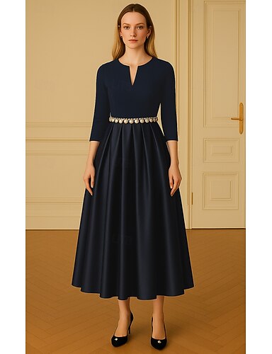 Платье A-Line с воротником портрета для матери невесты Элегантное винтажное платье с V-образным вырезом Чайной длины миди Растяжимое атласное с 3/4 рукавами с рюшами однотонного цвета