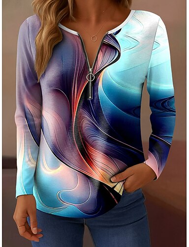Жен. Футболка Омбре Графика Абстракция Элегантный стиль Винтаж Стиль Длинный рукав V-образный вырез Обычные топы Повседневные выходные Молния С принтом Синий Лиловый Оранжевый Серый Весна Осень