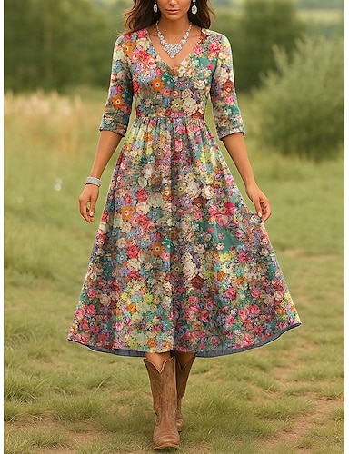 Жен. Платье средней длины Повседневное платье Платье A-силуэта Отпуск На каждый день Стандартный Цветочный принт Графика Рукав 3/4 V-образный вырез Розовый Красный Темно синий Синий Весна Осень