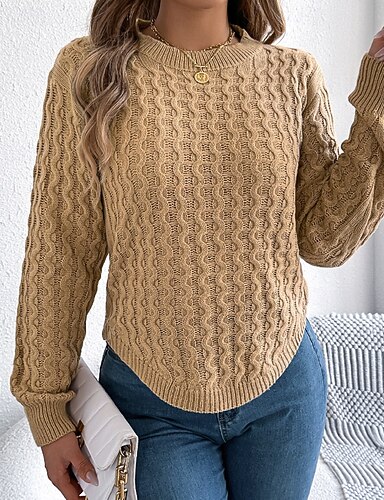 Жен. Вязаная ткань На каждый день Мягкий Чистый цвет Рельефный узор Вырез под горло Трикотаж Длинный рукав Обычные топы Вязать на открытом воздухе Повседневные выходные Абрикосовый Осень Зима