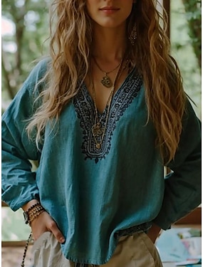 Жен. Блуза Цветочный принт Графика Богемия Винтаж тропический Рукав 3/4 V-образный вырез Обычные топы Синий Лето Весна