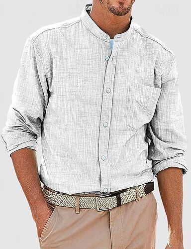 Муж. Рубашка Поповер Рубашка Летняя рубашка Одежда для пляжа Повседневная рубашка Рубашка с воротником-стойкой Черный Белый Светло-синий Длинный рукав Полотняное плетение Воротник-стойка