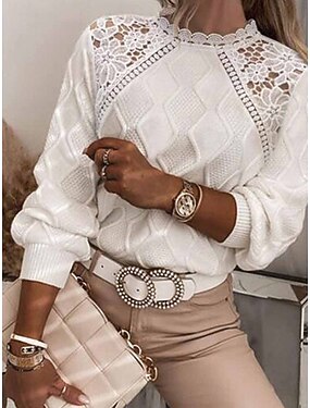 Жен. Кружевной топ Полотняное плетение Мода Современное На каждый день Длинный рукав Хомут Обычные топы Повседневные выходные Кружева Пэчворк Белый Синий Весна Осень