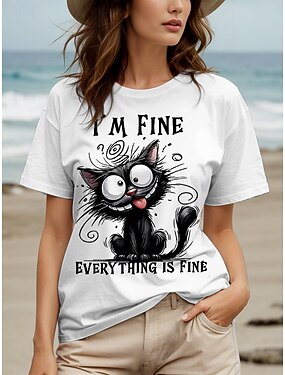 Жен. Футболка Графика Животное Кот Винтаж Стиль Классика С короткими рукавами Вырез под горло Круглый вырез Обычные топы Повседневные выходные С принтом Черный Белый Розовый Красный Синий Лето Весна