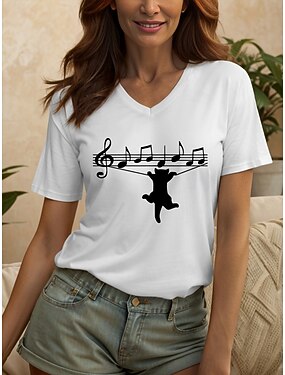 Жен. Блуза Графика Кот Буквы Винтаж Стиль Классика С короткими рукавами V-образный вырез Обычные топы Повседневные На выход Одежда для пляжа С принтом Черный Белый Лето Весна