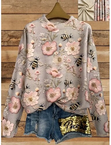 Жен. Вязаная ткань На каждый день Мягкий Цветочный принт Графика Животное Рельефный узор Вырез под горло Трикотаж С принтом Длинный рукав Обычные топы Вязать на открытом воздухе Повседневные выходные