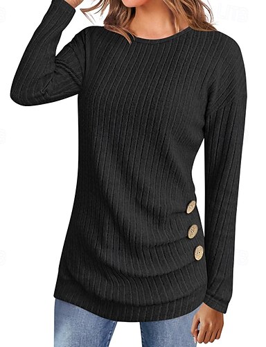 Жен. Вязаная ткань Пуловер Уличный стиль На каждый день Сплошной цвет Рельефный узор Вырез под горло Пуговицы Трикотаж Длинный рукав Обычные топы Вязать Повседневные Праздники выходные