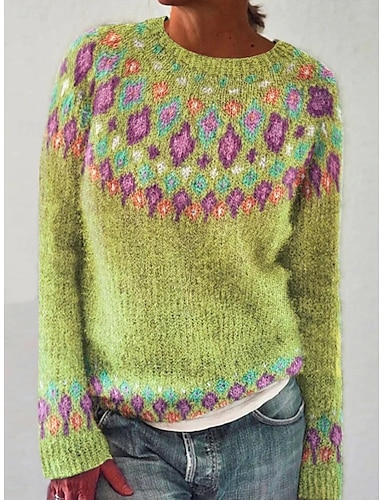 Жен. Вязаная ткань На каждый день Мягкий Геометрический принт Рельефный узор Вырез под горло Трикотаж С принтом Длинный рукав Обычные топы Вязать на открытом воздухе Повседневные выходные Желтый Синий