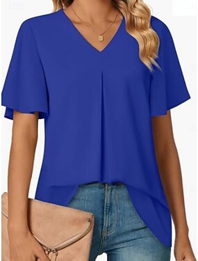 Жен. Футболка Полотняное плетение Мода Современное На каждый день С короткими рукавами V-образный вырез Обычные топы Повседневные выходные Красный Тёмно-синий Небесно-голубой Хаки Лето