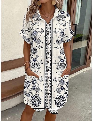 Жен. Платье средней длины Платье прямого кроя Летнее платье Отпуск На каждый день Повседневные Стандартный Цветочный принт Графика С короткими рукавами Вырез под горло