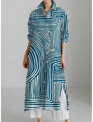 Жен. длинное платье платье макси Платье-рубашка Повседневное платье Мода Современное Повседневные Праздники выходные Стандартный Геометрический принт Контрастных цветов Рукав 3/4 Рубашечный воротник