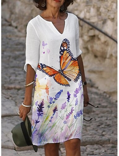 Жен. Платье средней длины Повседневное платье Платье с принтом Мода Современное Повседневные Пляж выходные Стандартный Цветочный принт Бабочка Рукав 3/4 Вырез под горло Желтый Синий Лиловый Оранжевый
