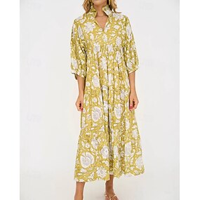 Жен. Платье средней длины Повседневное платье Цветочное платье Платье с принтом Мода Современное Отпуск Праздники На выход Стандартный Цветы Рукав 3/4 Рубашечный воротник Светло-желтый Лето