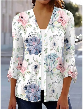 Жен. Рубашка Цветочный принт Графика Элегантный стиль Винтаж Повседневные Рукав 3/4 V-образный вырез Обычные топы Повседневные На выход Оборки Пуговицы Белый Розовый Синий Лето Весна Осень