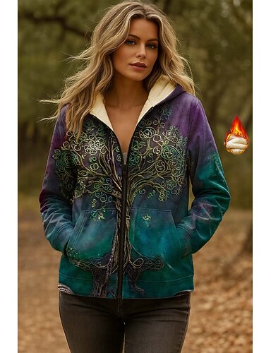 Жен. Толстовки на молнии Графика Геометрический принт Огурцы Элегантный стиль Теплый Винтаж Длинный рукав Капюшон Обычные топы Дом Офис Вечерние наряды Застегнуться Молния С принтом Зеленый
