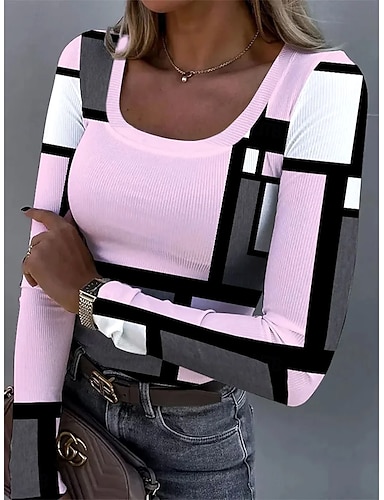 Женская футболка Длинный рукав Графический Геометрический Винтажный Стильный Классический Длинный рукав Вырез с заострением Обычные топы Повседневная Печать Красный Синий Фиолетовый Зеленый Весна