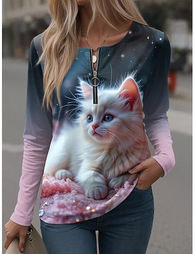 Жен. Футболка Графика Животное Винтаж Стиль На каждый день Длинный рукав Круглый вырез Обычные топы Повседневные выходные Молния С принтом Синий Лиловый Зеленый Весна Осень Зима