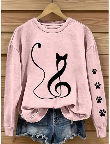 Жен. Пуловер Толстовка Графика Животное Кот На каждый день Длинный рукав Вырез под горло Обычные топы Для улицы Повседневные Праздники С принтом Розовый Синий Лиловый Оранжевый Зеленый