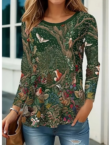 Жен. Футболка Цветочный принт Графика Растения Винтаж Стиль Классика Длинный рукав Вырез под горло Круглый вырез Обычные топы Повседневные С принтом Зеленый Весна Осень Зима