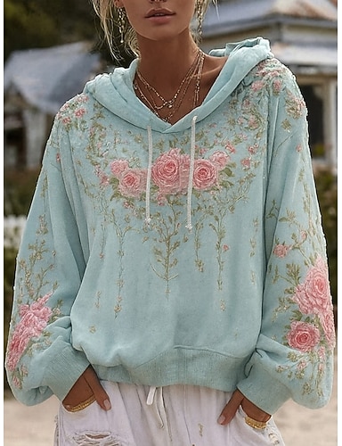 Женская 3D печать винтажного бохо худи патчворк худи свитшот цветочный пуловер свитшот элегантный активный с длинными рукавами капюшон стритстайл ежедневная носка повседневный светло-голубой весна
