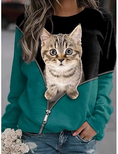 Жен. Пуловер Толстовка Худи Графика Животное Кот Мода На каждый день Длинный рукав Вырез под горло Круглый вырез Обычные топы Для улицы На каждый день С принтом Темно-зеленый Весна Осень Зима