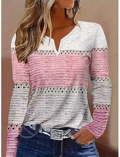 Жен. Футболка Графика Полоски Геометрия Винтаж Стиль Классика Длинный рукав V-образный вырез Зубчатая шея Обычные топы Повседневные выходные С принтом Пыльная роза Весна Осень Зима