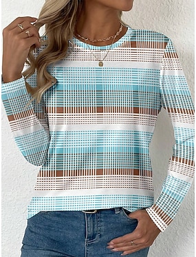Женская футболка с длинным рукавом круглый вырез длинный рукав туника графика геометрическая клетчатая повседневная круглый вырез обычные топы повседневные печать розовый фиолетовый зеленый весна