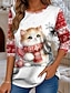 Новогодняя тематика Жен. Футболка Графика Животное Кот Мода На каждый день Длинный рукав Вырез под горло Обычные топы Повседневные выходные С принтом Красный Лето Весна Осень Зима
