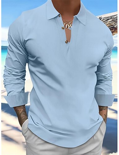 Муж. Рубашка из хлопка и льна Полотняное плетение Отпуск Черный Белый Розовый Небесно-голубой Длинный рукав Отложной Одежда