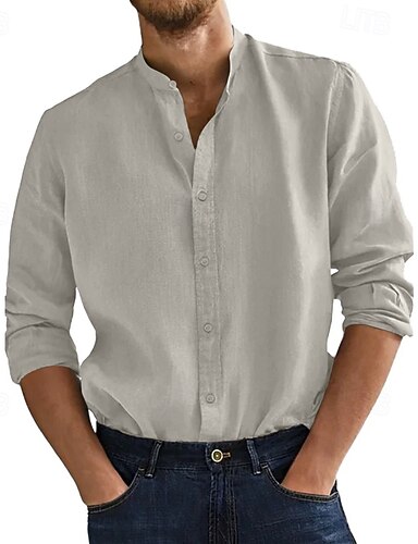 Муж. Рубашка с воротником-стойкой Летняя рубашка Одежда для пляжа Кнопка рубашка Сплошной цвет Отпуск Кьюриз Черный Белый Серый Светло-синий Длинный рукав Хенли Весна & осень Одежда Кнопка вниз