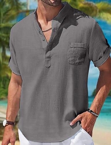 Муж. льняная рубашка Рубашка с воротником-стойкой Летняя рубашка Одежда для пляжа Полотняное плетение Отпуск Кьюриз Белый Синий Цвет хаки Серый С короткими рукавами Воротник-стойка Весна лето Одежда
