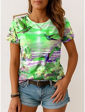 Жен. Футболка Цветочный принт Графика Птица Винтаж Стиль Классика С короткими рукавами Вырез под горло Круглый вырез Обычные топы Повседневные выходные С принтом Желтый Розовый Синий Зеленый