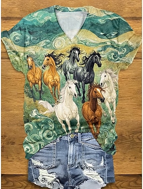 Жен. Футболка Графика Животное Буквы Винтаж Стиль Классика С короткими рукавами V-образный вырез Обычные топы Повседневные С принтом Черный Белый Синий Зеленый Серый Лето Весна
