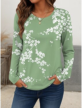 Женская футболка с круглым вырезом длинный рукав туника floral графика элегантная повседневная круглой вырез обычные топы ежедневные принт синий пурпурный зеленый осень