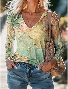 Женская футболка с V-образным вырезом длинными рукавами графический повседневный омбре-растения элегантный винтажный стильный обычный топ с повседневной печатью синий оранжевый зеленый лето весна
