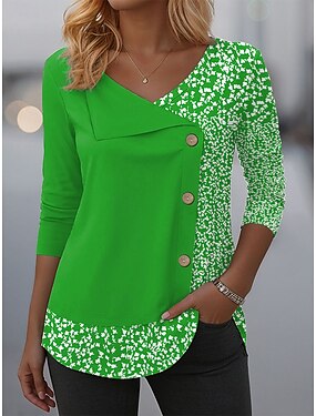 Жен. Футболка Омбре Графика Винтаж Мода Стиль Длинный рукав V-образный вырез Асимметричная шея Обычные топы Повседневные выходные Одежда для отпуска Пуговицы С принтом